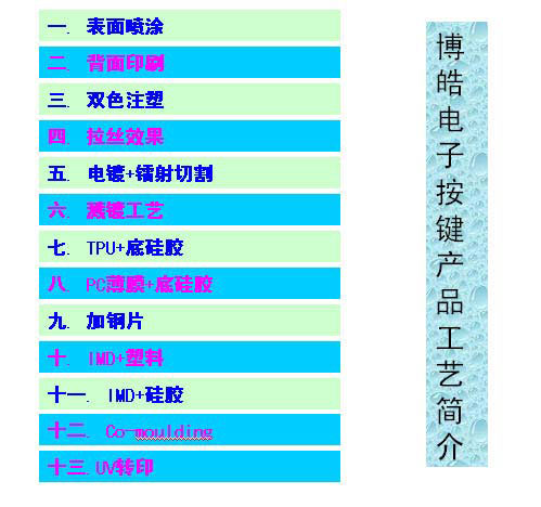 我們博皓電子在生產(chǎn)硅膠按鍵的時候一共分為十三道工序,包括表面噴涂、背面印刷、雙色注塑、拉絲效果、電鍍+鐳射切割、濺鍍工藝、TPU+底硅膠、PC薄膜+底硅膠、加鋼片、IMD+塑料、IMD+硅膠、Co-moulding、UV轉(zhuǎn)印。工藝詳細(xì)性就不一一介紹了,著重介紹下我們的表面噴涂、表面噴涂、背面印刷、雙色注塑拉絲效果和電鍍+鐳射切割工藝。
