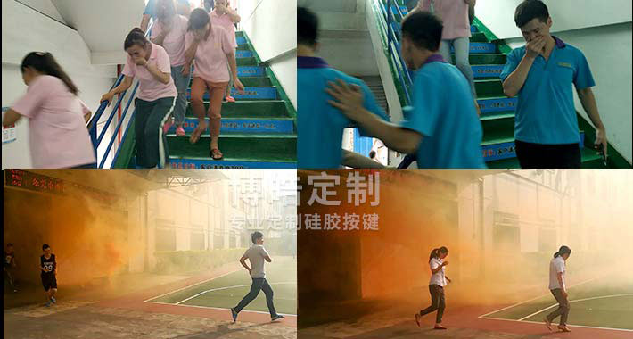 消防演習(xí)現(xiàn)場模擬演示一場突如其來的大火,拉起煙霧彈,一時(shí)煙霧四起并迅速蔓延,拉起警報(bào)后,正在生產(chǎn)汽車硅膠按鍵的家人緊急“逃生”,從東西兩個(gè)消防通道迅速、有序撤離。逃生時(shí),員工們彎腰、低頭、用毛巾或衣服捂住口鼻迅速撤離到操場安全區(qū)域,各部門集合整隊(duì)清點(diǎn)人數(shù),整個(gè)疏散過程緊張、有序。
