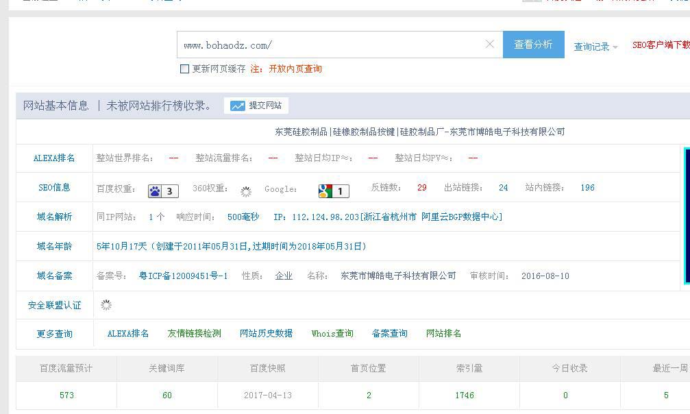 今天早上小編查詢博皓電子官網(wǎng)的站長的SEO數(shù)據(jù),發(fā)現(xiàn)一個不小的驚喜,那就是博皓電子(m.njgsgs.cn)官網(wǎng)百度權(quán)重到3了。之前小編一直在心中提問,硅膠制品行業(yè)的官網(wǎng)可以優(yōu)化到3不?當(dāng)時心中是認(rèn)為不太可能的,今天也終于實(shí)現(xiàn)了。