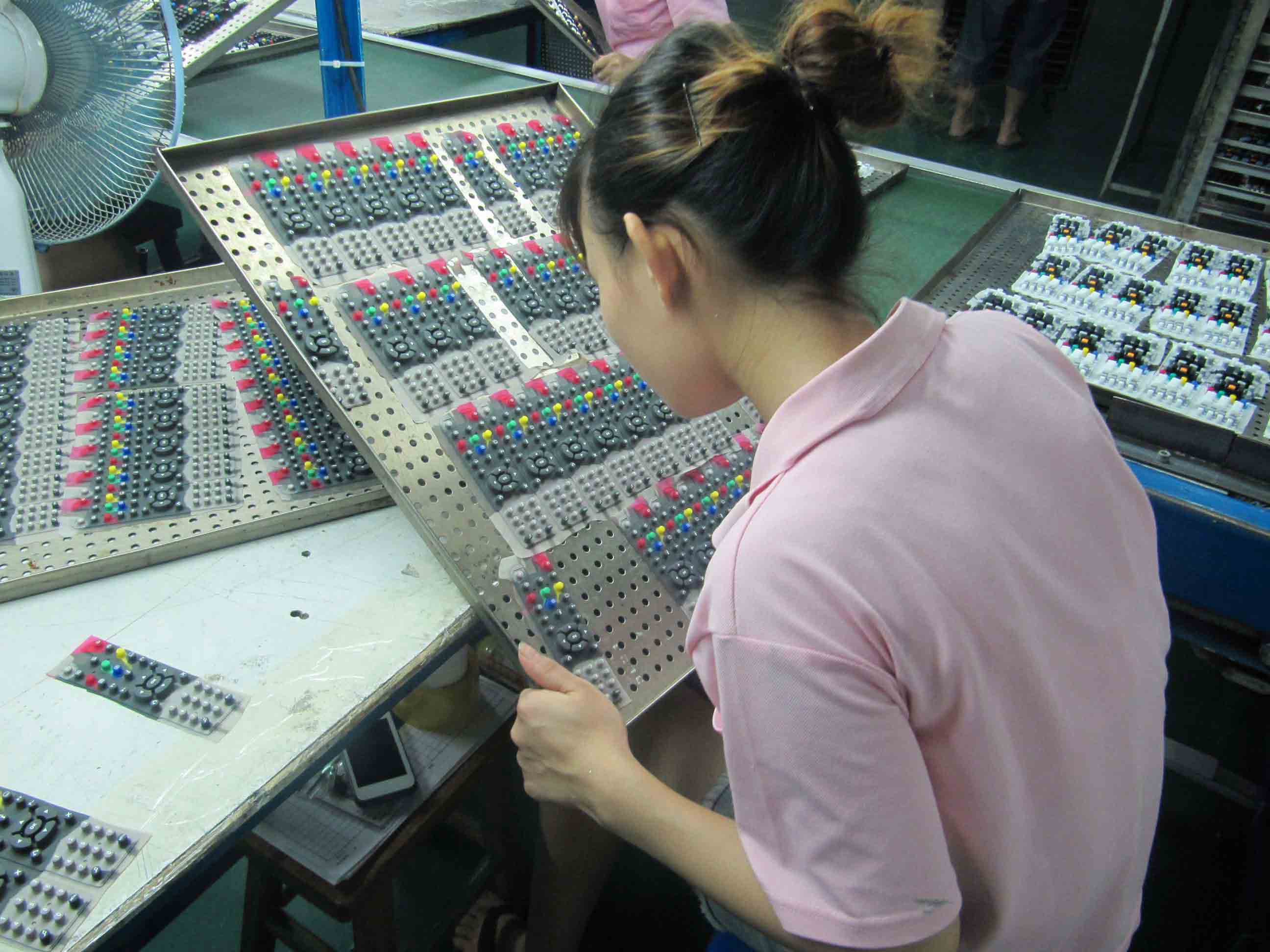 從絲印工藝要求講:一般現(xiàn)在的硅膠按鍵都是需要絲印四五種的顏色,每一種顏色都是需要經(jīng)過一次檢查和烘烤的。博皓電子在管控絲印品質(zhì)過程中增加一個FQC檢查崗位,在絲印完成后烘烤前會檢查員會把產(chǎn)生的不良挑選出來,并且擦拭干凈重新絲印。一般的小型工廠是不會增加這種檢查崗位的,這就是博皓電子能生產(chǎn)出品質(zhì)過關(guān)而且具備優(yōu)勢的性價比的硅膠制品的原因。