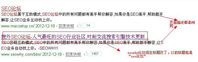 案例一、首先是我們搜索“seo論壇”,排名第一的既然是一個無與倫比的“仿站”,而且仿造的是很沒有水平,logo,頁面描述,關鍵詞,標題,首頁的大致布局,板塊的名稱全tmd的模仿seowhy論壇,如圖: