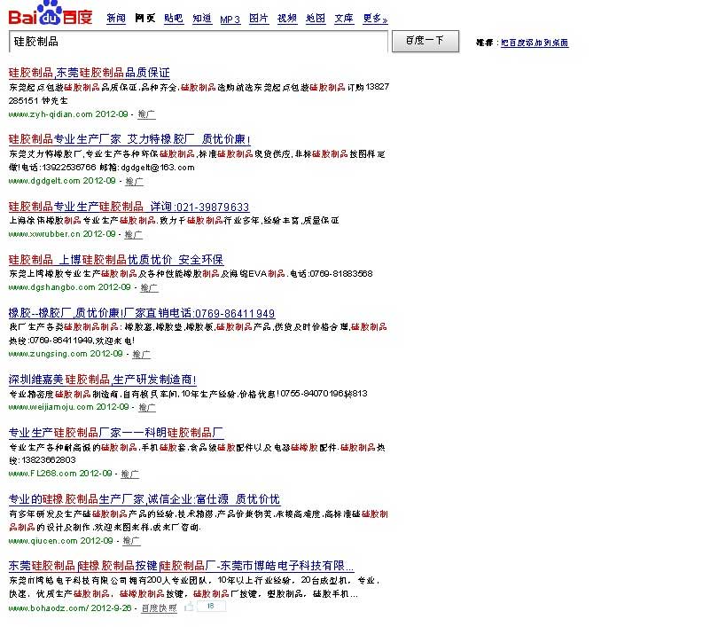 案例二、就是我們博皓電子優(yōu)化的關鍵詞“硅膠制品”相關的,進入百度搜索框,搜索“硅膠制品”呈現(xiàn)出來的是9個推廣鏈接然后才是正常的鏈接,而且推廣鏈接并沒有和自然優(yōu)化鏈接有明顯區(qū)別,這叫我們seoer的情何以堪啊,雖然我硅膠制品之前是排名第一,但是還是排名第十了,一天一個ip可能都木有,都貢獻給了推廣鏈接,百度你能讓我們相信你嗎?