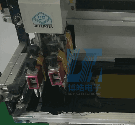 下面來到絲印部門,圖中是絲印黑色油墨,網(wǎng)版上是黑色的油墨,只需按一下開關,機器就會從左刷到右,硅膠按鍵完成一次字符印刷