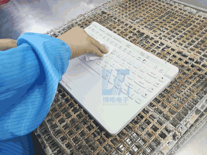 醫(yī)用硅膠鍵盤按鍵出紅外線烤箱后,需要進行表面清理,準備進入下一道工序。